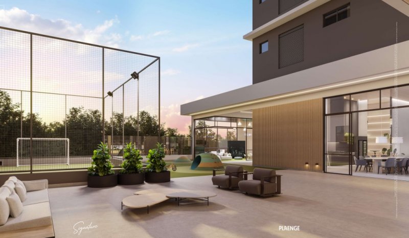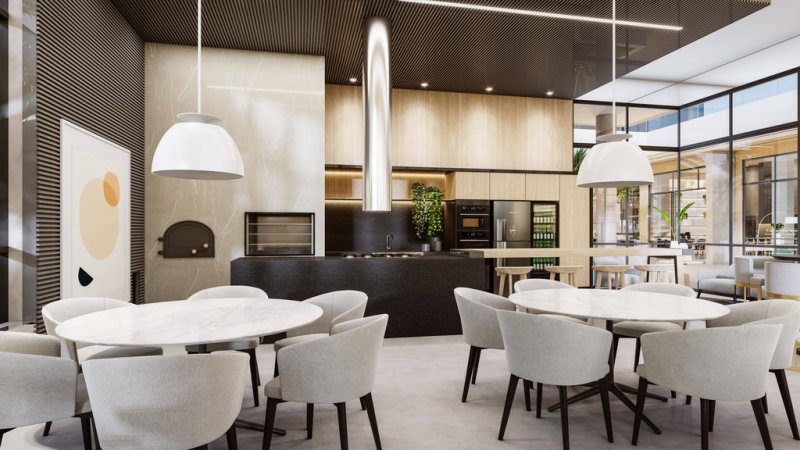 A área de lazer é completa, com playground, quadra esportiva, salão de festas com copa, fitness, piscina coberta e aquecida, sauna, espaço kids e espaço gourmet com churrasqueira a carvão.
