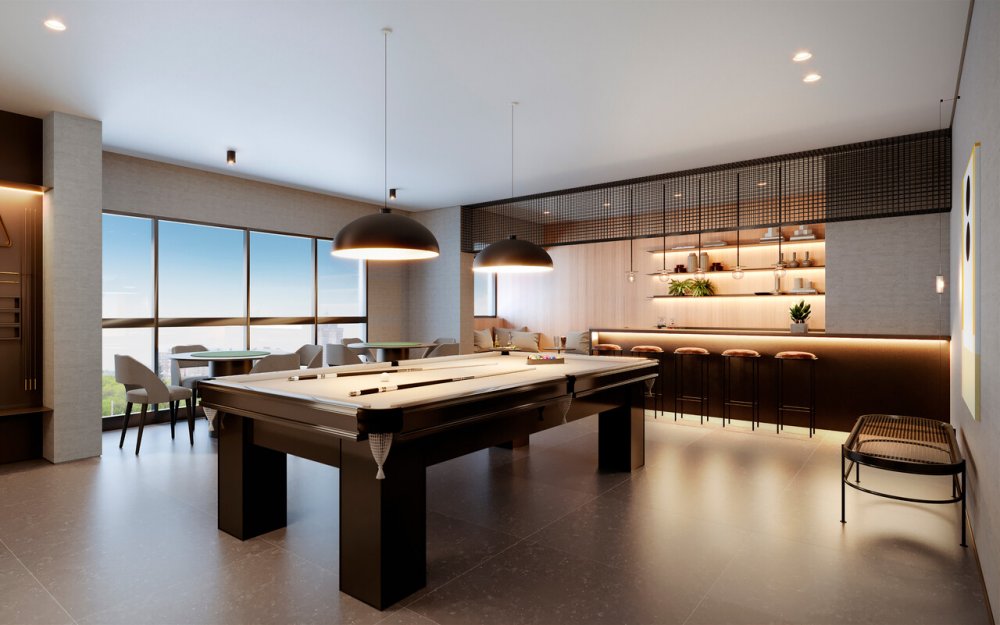 Ambientes da área de lazer mobiliados e decorados: tudo pronto para você se divertir sem se preocupar com nada.