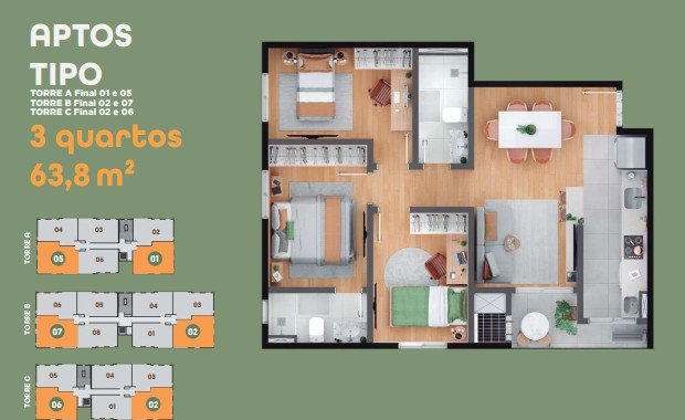 Apartamento à Venda com 3 dormitórios, sendo 1 suíte, 63,80 m²