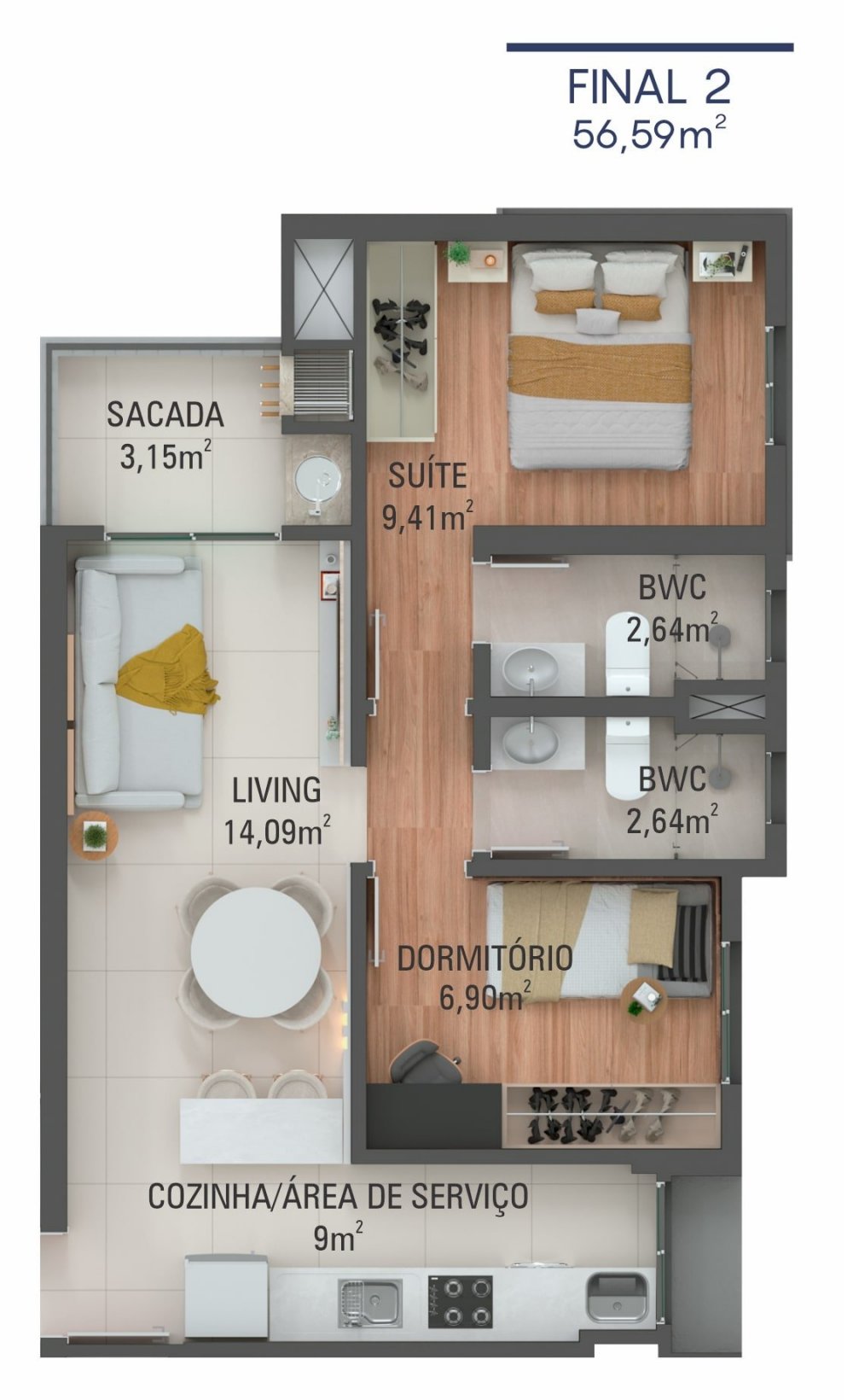Apartamento à Venda com 2 dormitórios, sendo 1 suíte, 56,59 m²