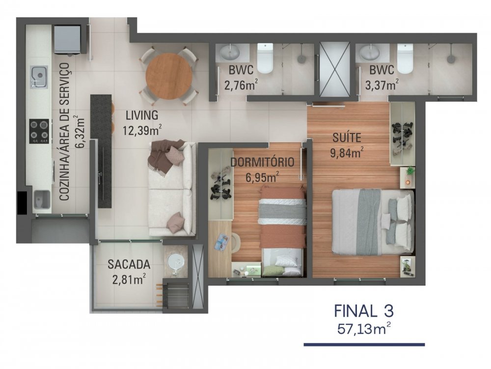 - Área Privativa: 57,13 m²