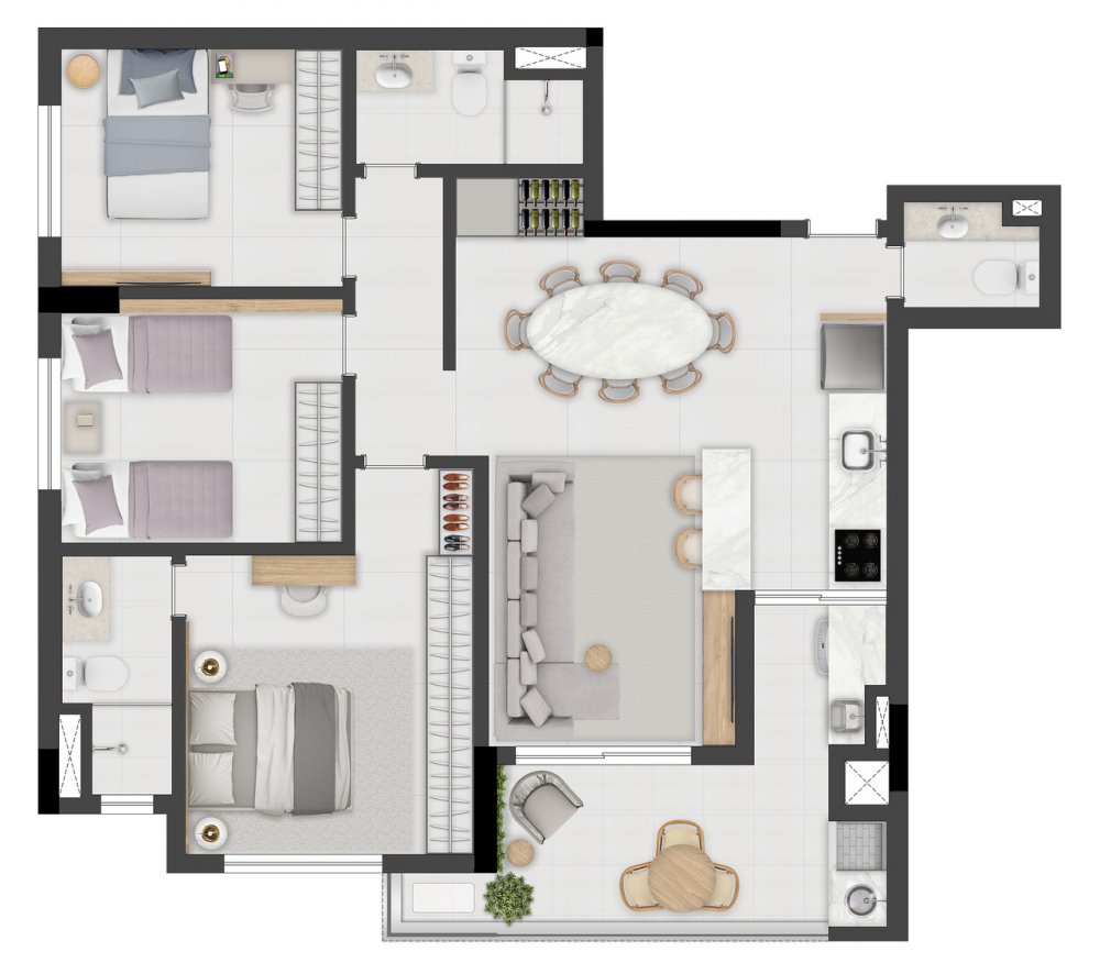 Apartamento à Venda com 3 dormitórios, sendo 1 suíte, 91,08 m²