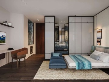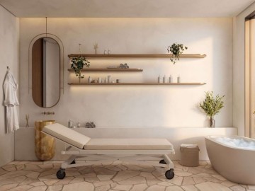 Acabamentos Premium: Bancadas em mármore com cubas de apoio ou semiencaixe e tratamento acústico nas tubulações.