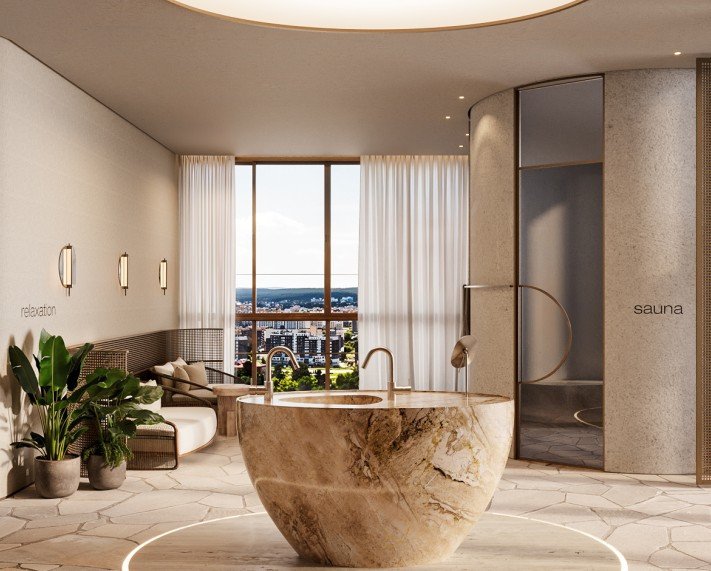 Acabamentos Premium: Bancadas em mármore com cubas de apoio ou semiencaixe e tratamento acústico nas tubulações.