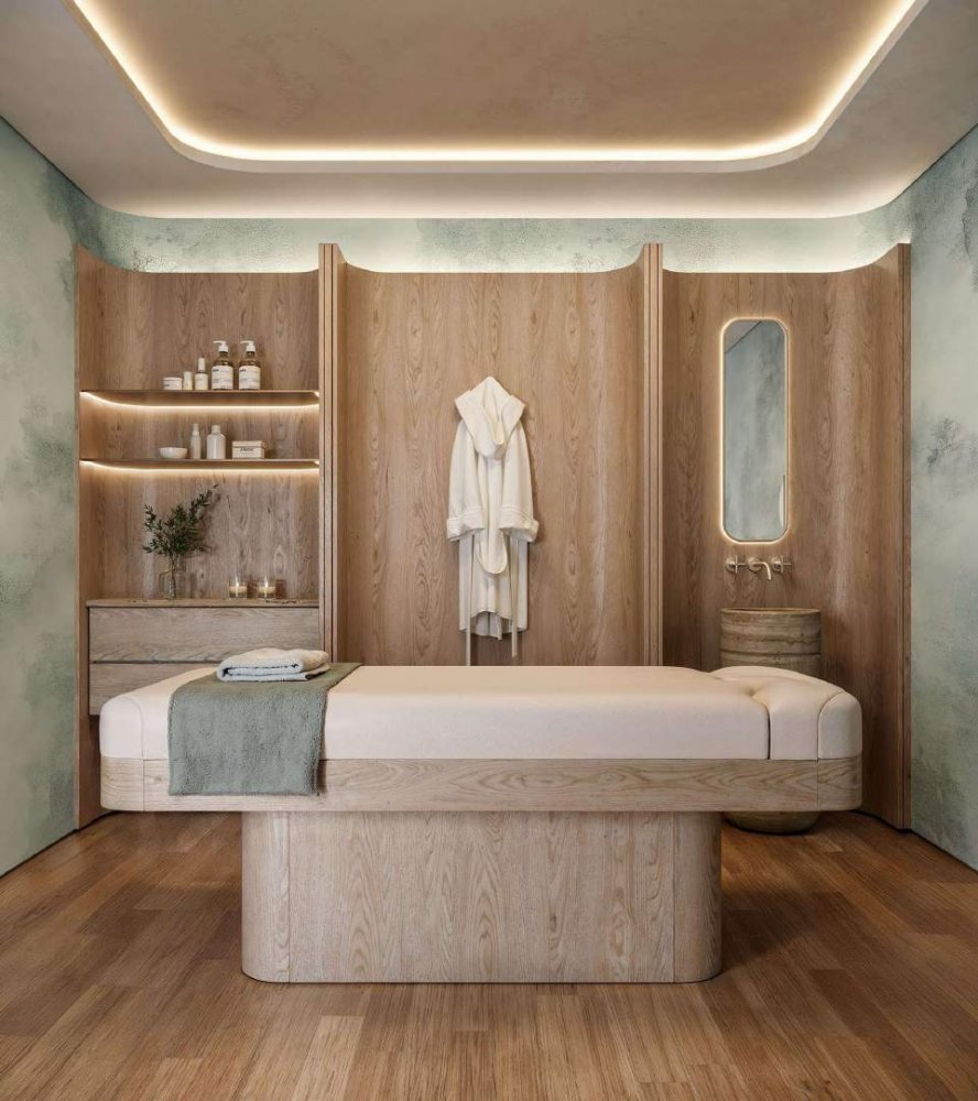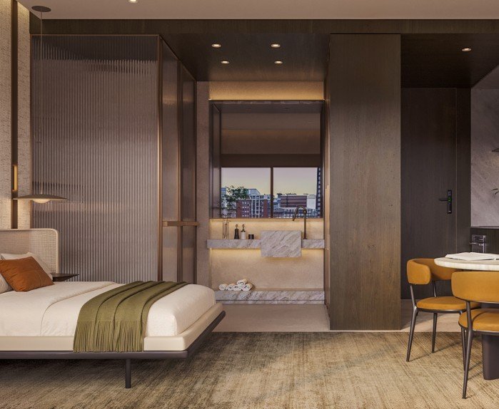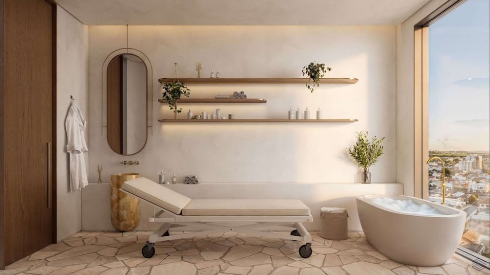 Acabamentos Premium: Bancadas em mármore com cubas de apoio ou semiencaixe e tratamento acústico nas tubulações.