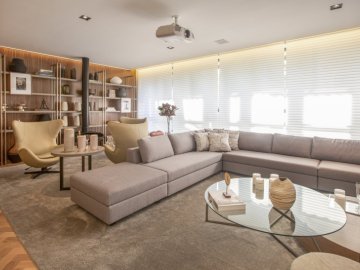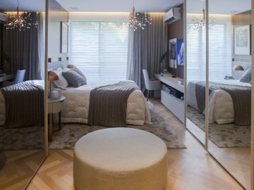 - Persianas internas embutidas no forro de gesso, com acionamento remoto, sem comprometer a atenuação acústica das esquadrias;